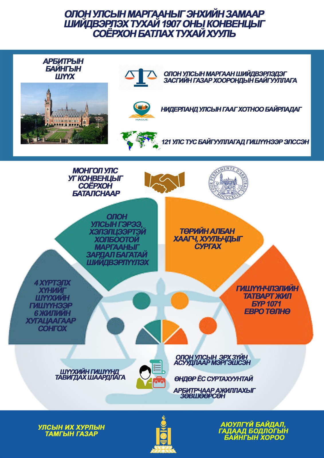 УИХ-ын 2018 оны намрын ээлжит чуулганы хугацаанд баталсан хууль тогтоомжуудын талаар бэлтгэсэн инфографикуудыг Та бүхэнд цувралаар хүргэж байна. Энэ удаа Олон улсын маргааныг энхийн замаар шийдвэрлэх тухай 1907 оны конвенцыг соёрхон батлах тухай хуулийн инфографик болон танилцуулгыг толилуулж байна.