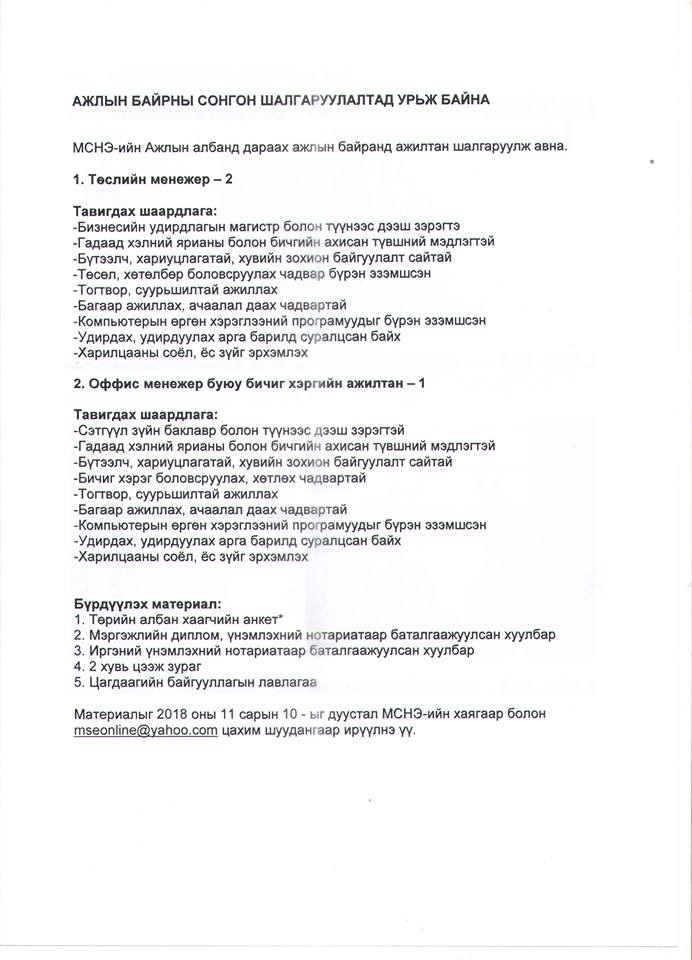 МСНЭ нээлттэй ажлын байранд урьж байна