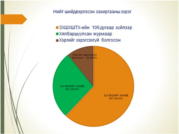 Шүүхээр зөрчигдсөн эрхээ хамгаалуулахаар хандсан иргэн, хуулийн этгээдийн нэхэмжлэл хэрхэн шийдвэрлэгдсэнийг судлан үзвэл Захиргааны хэрэг шүүхэд хянан шийдвэрлэх тухай хуулийн 106 дугаар зүйлээр 397 хэрэг маргааныг /шүүхийн шийдвэрээр / шийдвэрлэсэн байна. Энэ нь бүх шийдсэн хэргийн 62.6%-ийг эзэлж байгаа бол 54 хэрэг маргаан буюу 8,5%-д нь хэргийг хэрэгсэхгүй болгожээ.