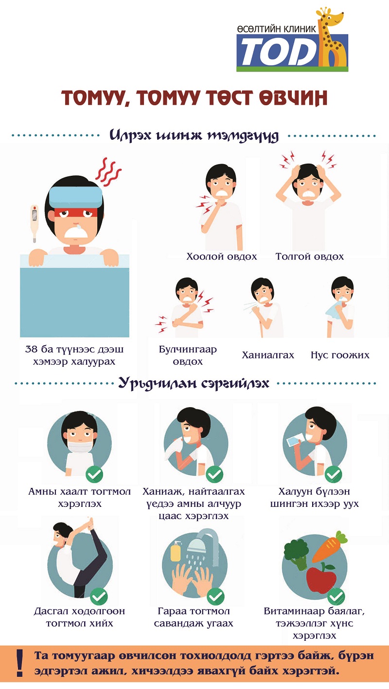 “Тод-Эйч” Хүүхдийн өсөлтийн клиникээс хүйтний улирал эхлэж буйтай холбоотойгоор Томуу, томуу төст өвчний талаар зөвлөгөө, мэдээлэл хүргэж байна.
