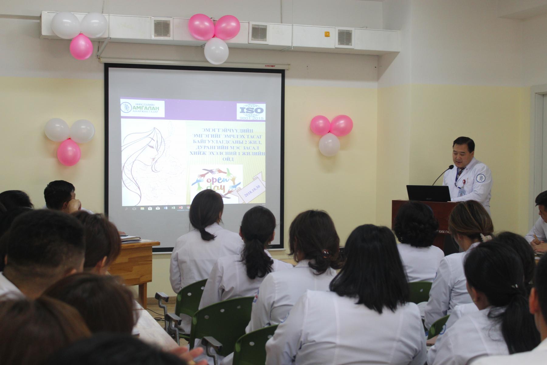 Нийслэлийн "Амгалан" амаржих газрын Эмэгтэйчүүдийн эмгэгийг эмчлэх тасаг байгуулагдсаны хоёр жил, дурангийн мэс засал хийж эхэлсний нэг жилийн ойн хүрээнд зохион байгуулагдсан “Нээлттэй хаалганы өдөрлөг” энэ сарын 30-ны өдөр боллоо. Энэхүү үйл ажиллагааг нээж амаржих газрын дарга Ц.Батболд үг хэлсэн бөгөөд ЭЭЭТ-ийн тасгийн эрхлэгч, клиникийн профессор, Анагаах ухааны магистр, тэргүүлэх зэрэгтэй эмч Л.Долгоржав эмэгтэйчүүдийн төрөлжсөн нарийн мэргэжлийн тусламж, үйлчилгээ болон тус тасгийн хоёр жилийн хугацаанд хийсэн ажлын ололт амжилт, цаашдын зорилтын талаар танилцууллаа.