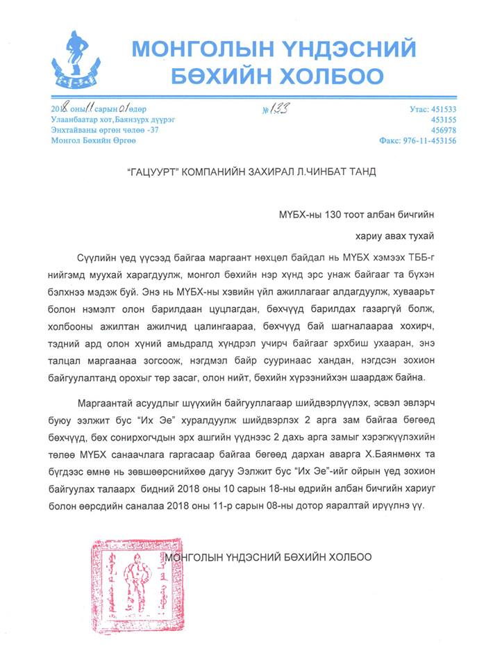 Монголын үндэсний бөхийн холбоо /МҮБХ/-ноос ээлжит бус “Их Эе”-ийг хамтран хуралдуулах саналыг "Гацуурт" компанийн захирал Л.Чинбатад өчигдөр (2018.11.01) дахин тавилаа. Дахин гэсний учир нь 2018 оны аравдугаар сарын 18-нд мөн МҮБХ-ны Гүйцэтгэх захирал, улсын заан Б.Сайнбаяр түүнд албан бичиг хүргүүлж, арваннэгдүгээр сард МҮБХ-ны ээлжит бус "Их Эе"-ийг зохион байгуулж, МҮБХ-ны асуудлаар маргаантай байгаа талууд хамтран хуралдахыг санал болгосон юм.
