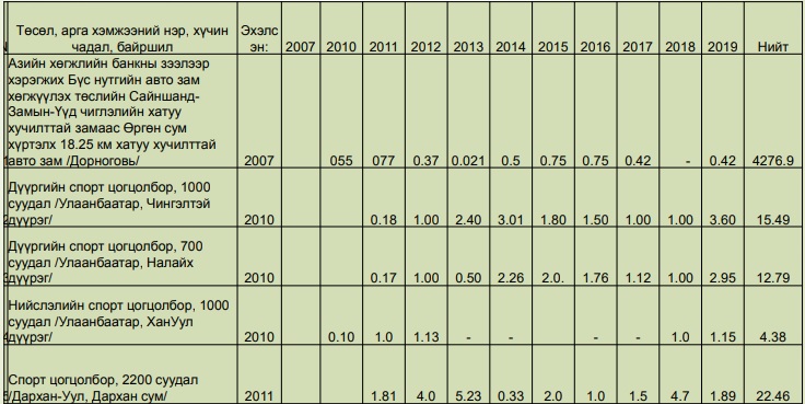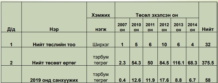 2010-2014 ОНД ЭХЭЛЖ, 2019 ОНЫ ТӨСӨВТ САНХҮҮЖҮҮЛЭХЭЭР ТУСГАСАН ТӨСЛҮҮДИЙН САНХҮҮЖИЛТИЙН ХУВААРЬ /тэрбум төгрөг/