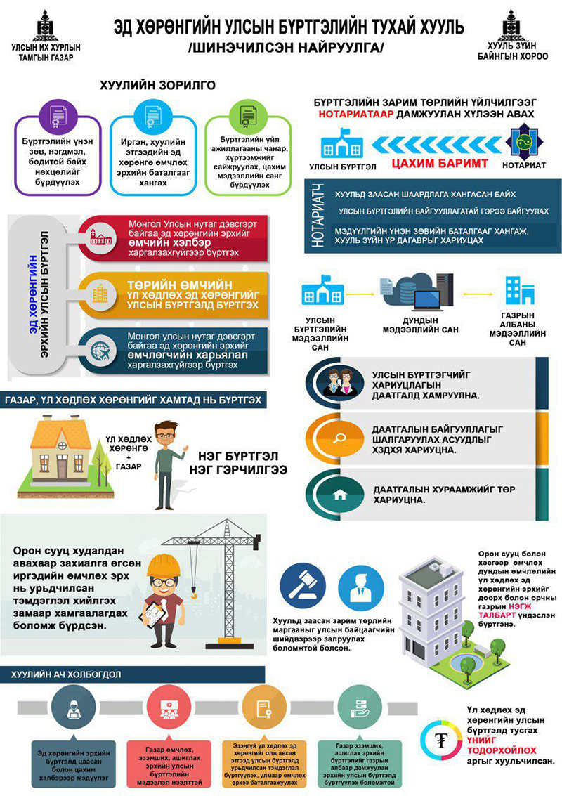Иргэний хуультай нийцүүлэн эд хөрөнгийн эрхийн улсын бүртгэлд бүртгүүлснээр үл хөдлөх эд хөрөнгө өмчлөх болон түүнтэй холбоотой бусад эрх үүсэхээр хуульчилж, улсын бүртгэлийн байгууллага өмчлөх эрхийг бүртгэлд бүртгэснийг нотолж, гэрчилгээ олгохоор тусгалаа.