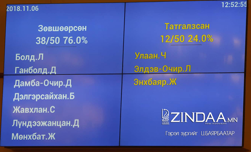 УИХ-ын чуулганы нэгдсэн хуралдаанаар /2018.11.06/ ХХААХҮ-ийн сайд Б.Батзоригийг үүрэгт ажлаас нь чөлөөлөх асуудлыг хэлэлцэж, санал хураалтад оролцсон 50 гишүүний 76 хувийн саналаар сайдаас огцруулах шийдвэр гаргалаа.