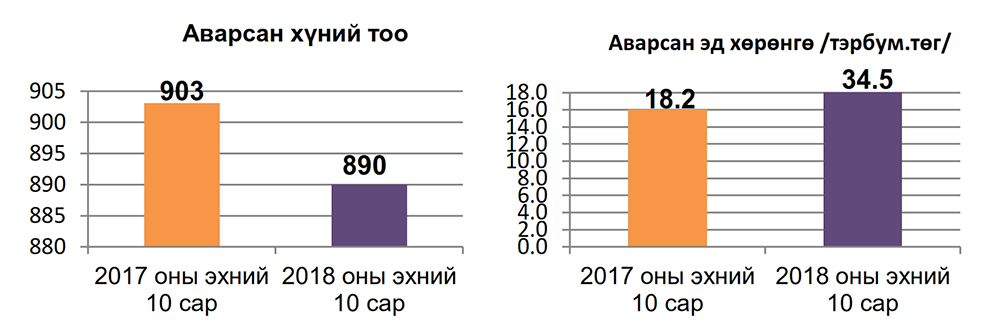 Мөн өнгөрсөн оны мөн үетэй харьцуулахад аюулт үзэгдэл, ослоос аварсан хүний тоо 13-аар буурч, аварсан эд хөрөнгө 16.3 тэрбум төгрөгөөр нэмэгдсэн байна.