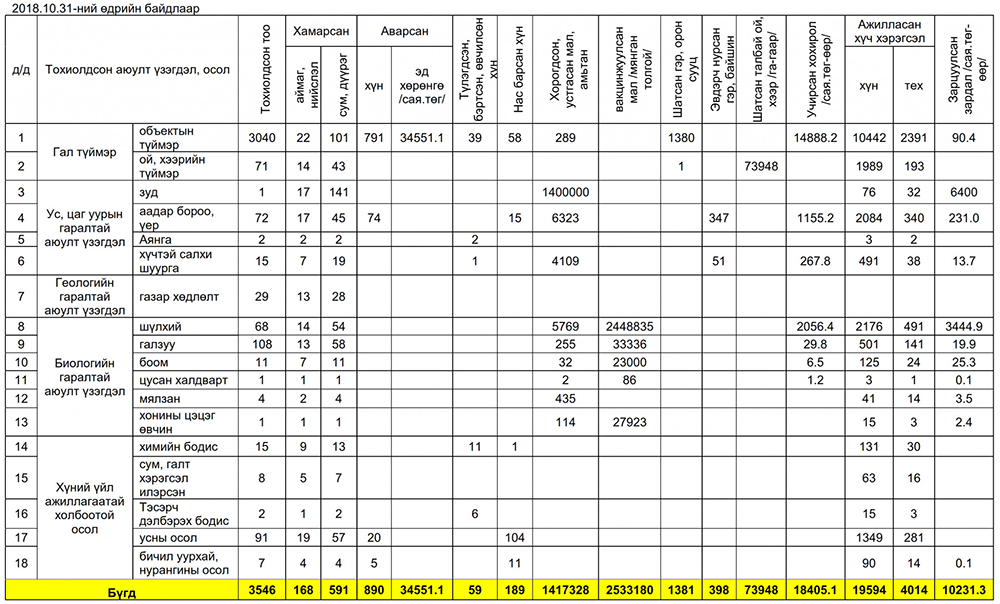Он гарсаар улсын хэмжээнд аравдугаар сарын байдлаар нийт 3546 удаа аюулт үзэгдэл, осол тохиолдож, үүний улмаас 189 хүн амь насаа алдаж, 59 хүн гэмтэж бэртэн 1417.1 мянган толгой мал хорогдож, 18.4 тэрбум төгрөгийн хохирол учирчээ.