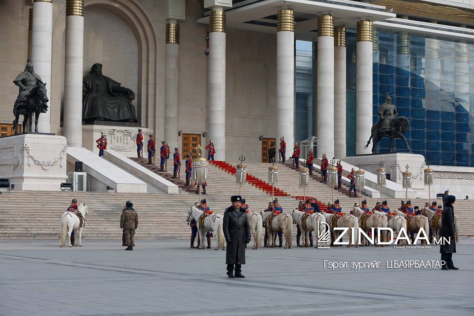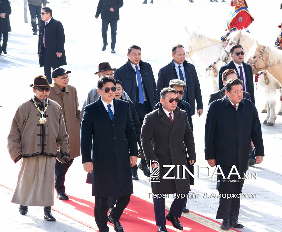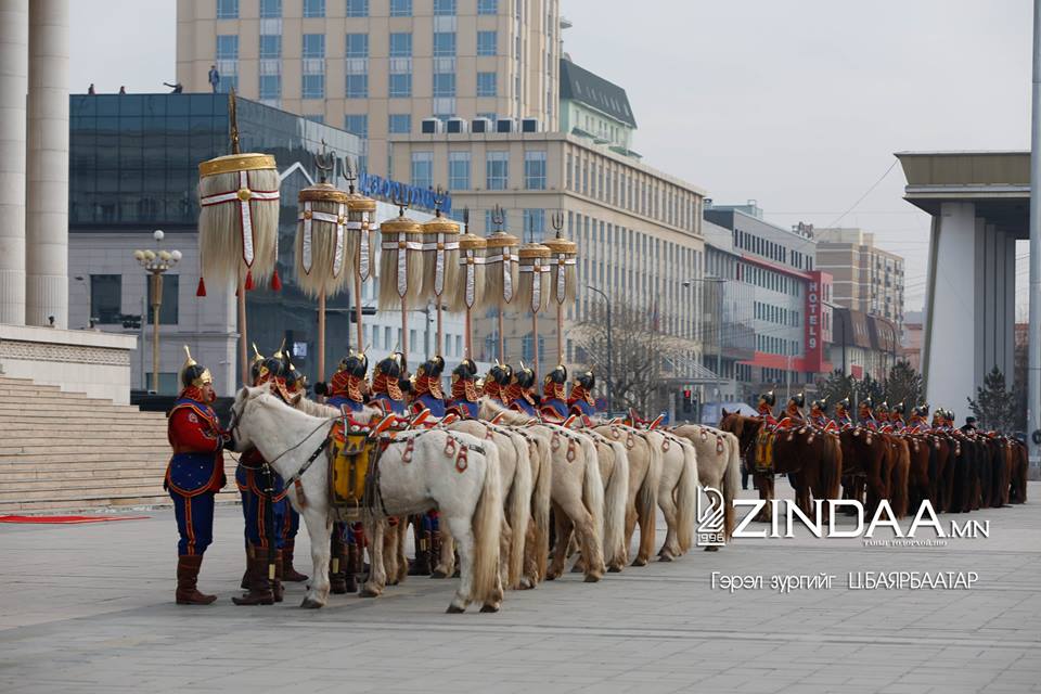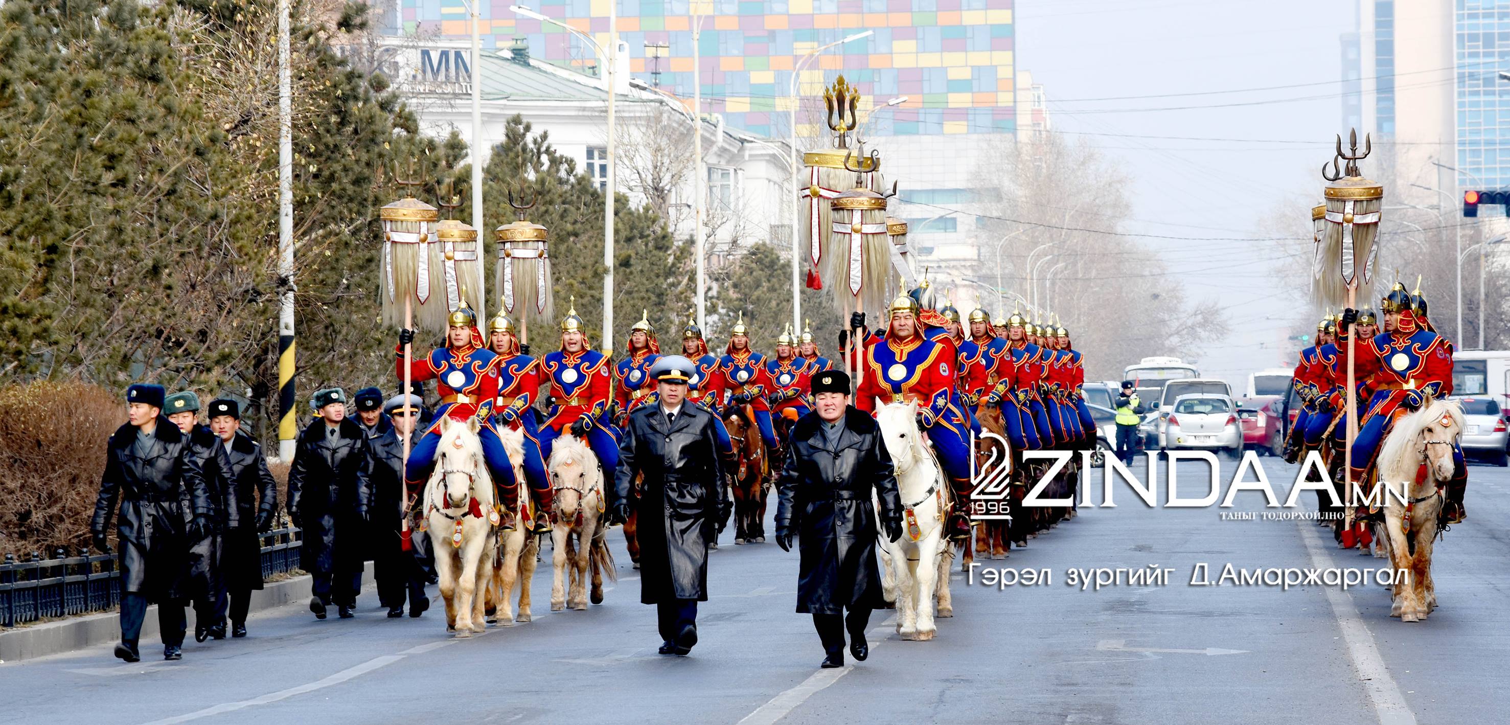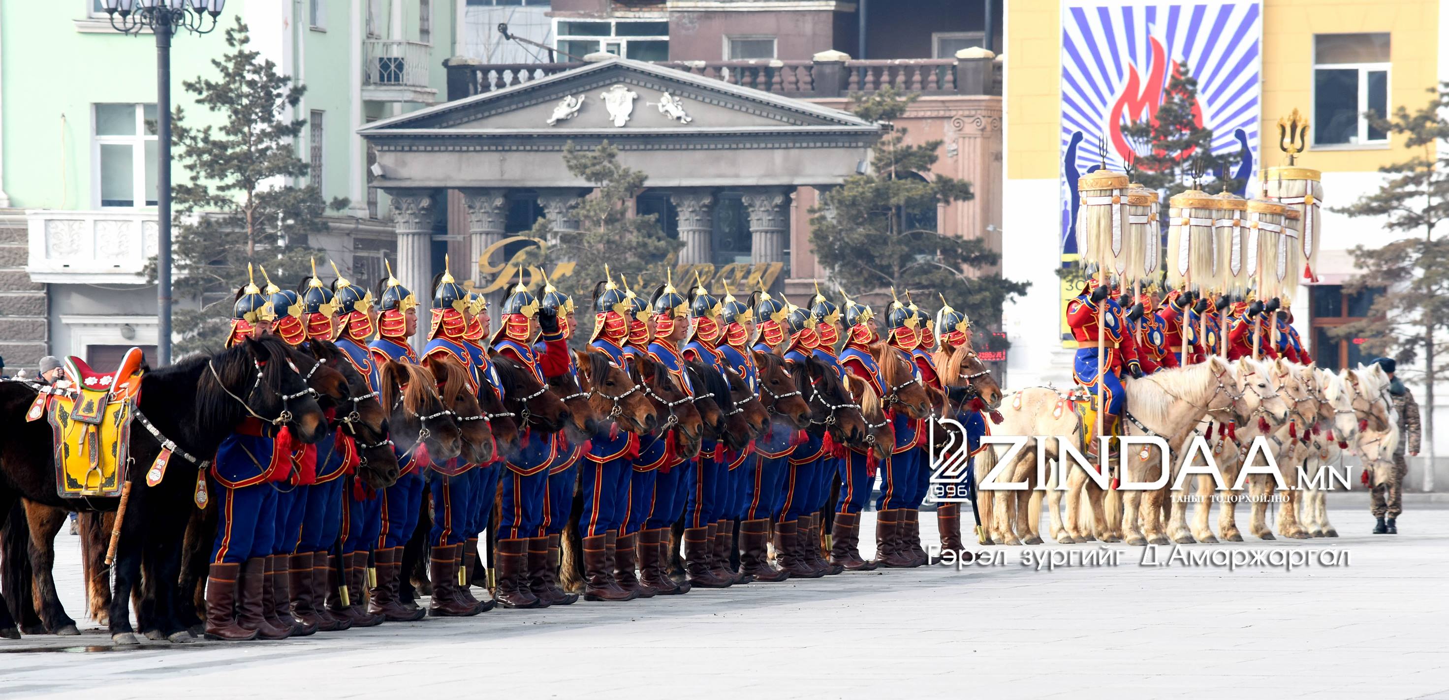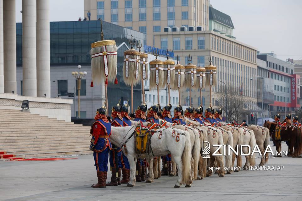 Их цагаан сүлдийг цэнгүүлэхэд хээр зүсмийн морьд хүлэглэсэн торгон цэрэг, төрийн тусгай хамгаалалтынхан дагалдаж, зэвсэгт хүчний үлээвэр найрал хөгжим хүндэтгэлийн ая эгшиглүүлэв.