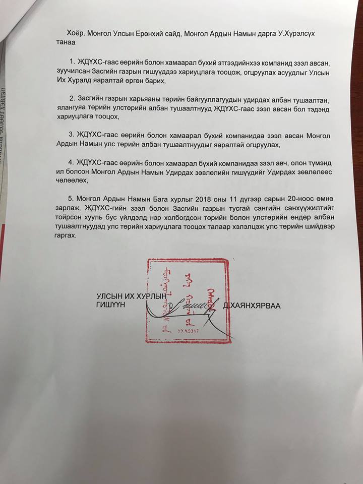Түүнчлэн нэр холбогдсон сайд, гишүүдийг УИХ-ын Ёс зүйн дэд хороогоор оруулах, Жижиг, дунд үйлдвэрийг хөгжүүлэх сангаас зээл авсан нөхдөд шат, шатандаа хариуцлага тооцох, зээл авсан нь тогтоогдвол албан тушаалаас нь чөлөөлөх, УИХ-аас Ажлын хэсэг байгуулж, үр дүнг нь яаралтай танилцуулахыг албан шаардлагад дурджээ.