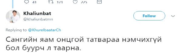 Тэгвэл Сангийн яамыг удирдаж буй сайдын хувьд импортлогчид үнээ бууруулах нөхцөл бүрдлээ гэж харж байна. Харин импортлогчдын эрх ашгийг төлөөлж дуугардаг М.Халиунбат төр татвар нэмж тоглочихгүй бол үнэ буурах боломж бий гэж харж байна. Ч.Хүрэлбаатар сайдын жиргээнээс харахад онцгой албан татварт хуруугаа ч хүргэхгүй бололтой. Энэ бол харьцангуй нааштай байр сууриуд.