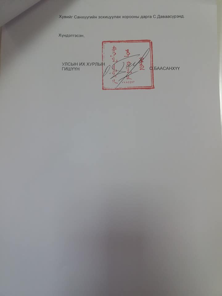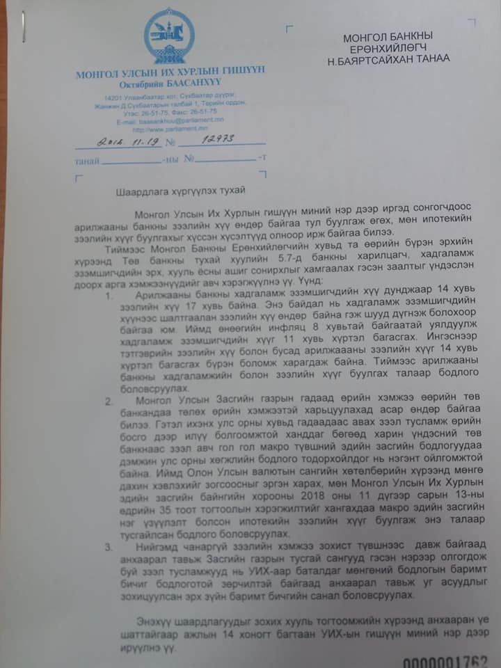 Тэрбээр "Монголбанкны ерөнхийлөгч Н.Баяртсайханд шаардлага хүргүүлж байна. Ипотекийн зээл олгогдохгүй байна гэсэн гомдол маш их ирж байна. Уг нь, Байнгын хорооны тогтоолын дагуу Засгийн газар, Монголбанк хамтран ипотекийн зээл олгох ёстой. Хадгаламжийн хүүг багасгах хэрэгтэй. Ингэж байж зээлийн хүү буурна. Инфляцитай уяалдуулаад хадгаламжийн хүүгээ 11 хувь болгох боломжтой харагдаад байгаа. Манай улс маш их өртэй боллоо. Өрийн хэмжээ үндэсний аюулгүй байдалд нөлөөлөх түвшинд хүрсэн байна" хэмээн онцолсон юм.