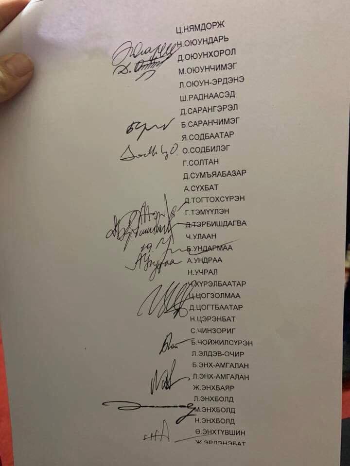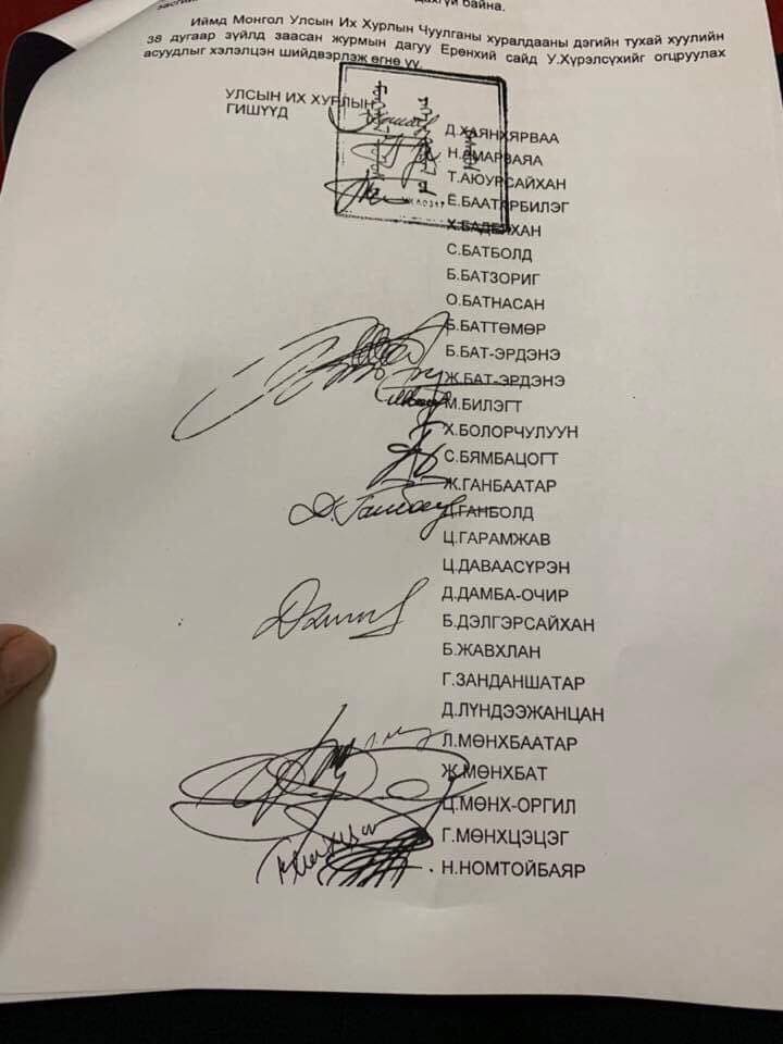 Дээрх үндэслэлээр нэр бүхий 27 гишүүн гарын үсэг зурсан албан бичгийг гардуулж өглөө.