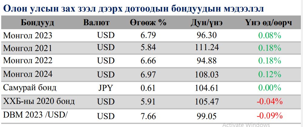Олон улсын зах зээл дээрх манай улсын дотоодын бондуудад уналт ажиглагдаад буй талаар мэдээлсэн. Тэгвэл /2018.11.20/ өчигдрийн байдлаар Худалдаа хөгжлийн банкны /ХХБ/ бонд, Монгол Улсын Хөгжлийн банкны бондуудын ханш унасан үзүүлэлттэй байна.