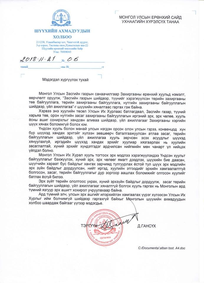 “Шүүхийн ахмадуудын холбоо”-ноос УИХ-ын дарга, Ерөнхий сайдад мэдэгдэл хүргүүллээ.