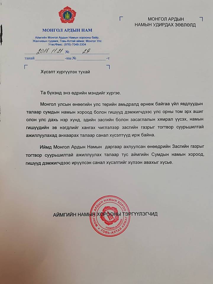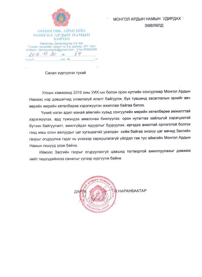 Иймд МАН-ын даргаар ахлуулсан өнөөгийн Засгийн газрыг тогтвор суурьшилтай ажиллуулах талаар тус аймгийн сумдын намын хороод, гишүүд, дэмжигчдээс ирүүлсэн санал хүсэлтийг хүлээн авахыг хүсье” гэжээ.