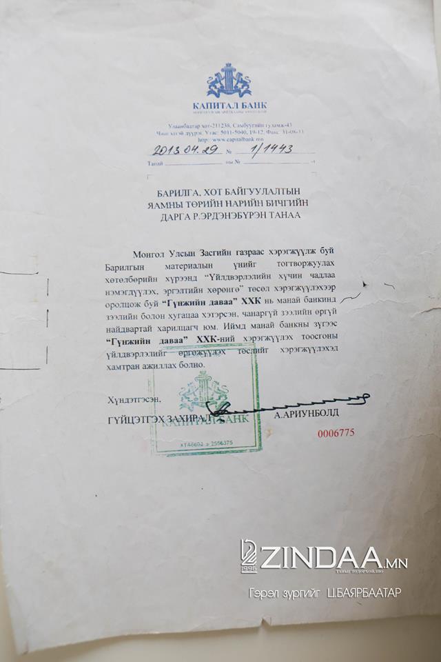 Эндээс л тухайн үед өнөөгийн Б.Ундармаа гишүүний хамаарал бүхий Капитал банк чанараа таниулж эхэлжээ. 2013 оны долдугаар сарын 9-нд зээл олгох шийдвэр гарч, 13-ны өдөр үнэ тогтворжуулах хөтөлбөрөөс авсан 500 сая төгрөг “Гүнжийн даваа” компанид шилжин орох байсан ч ороогүй аж. Компани яагаад мөнгө ороогүйг асуухад зээлийн төлбөртөө суутгаж авсан гэдэг мэдээллийг Капитал банкны зээлийн эдийн засагч хэлжээ.