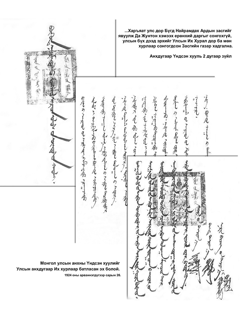 5. Хуудас бүр дээр нь “Ардын эрхт Монгол Улсын Хурлын тамга” гэсэн дөрвөлжин тамга дарсан Монгол Улсын анхдугаар Үндсэн хуулийн 18 хуудас эх бичиг, тус Үндсэн хуулийн зүйл заалтыг тайлбарласан 72 хуудас тайлбар сэлтийн хамт эдүгээ Архивын ерөнхий газрын сан хөмрөгт хадгалагдаж байна.