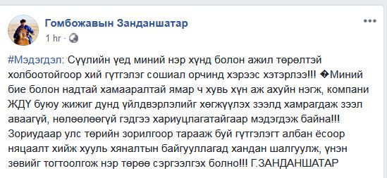 Мэдэгдэл: "Сүүлийн үед миний нэр хүнд болон ажил төрөлтэй холбоотойгоор хий гүтгэлэг сошиал орчинд хэрээс хэтэрлээ!!! Миний бие болон надтай хамааралтай ямар ч хувь хүн аж ахуйн нэгж, компани ЖДҮ буюу жижиг дунд үйлдвэрлэлийг хөгжүүлэх зээлд хамрагдаж зээл аваагүй, нөлөөлөөгүй гэдгээ хариуцлагатайгаар мэдэгдэж байна!!! Зориудаар улс төрийн зорилгоор тарааж буй гүтгэлэгт албан ёсоор няцаалт хийж хууль хяналтын байгууллагад хандан шалгуулж, үнэн зөвийг тогтоолгож нэр төрөө сэргээлгэх болно!!! Г.ЗАНДАНШАТАР" гэжээ.