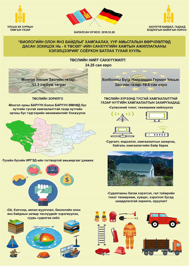 ИНФОГРАФИК: Монгол Улсын Засгийн газраас 2018 оны 10 дугаар сарын 17-ны өдөр өргөн мэдүүлсэн “Биологийн олон янз байдлыг хамгаалах, уур амьсгалын өөрчлөлтөд дасан зохицох нь-II төсөл”-ийн Санхүүгийн хамтын ажиллагааны хэлэлцээрийг соёрхон батлах тухай хуулийн төслийг Монгол Улсын Их Хурлын 2018 оны 10 дугаар сарын 26-ны өдрийн чуулганы нэгдсэн хуралдаанаар хэлэлцэн баталлаа. ДЭЛГЭРЭНГҮЙ