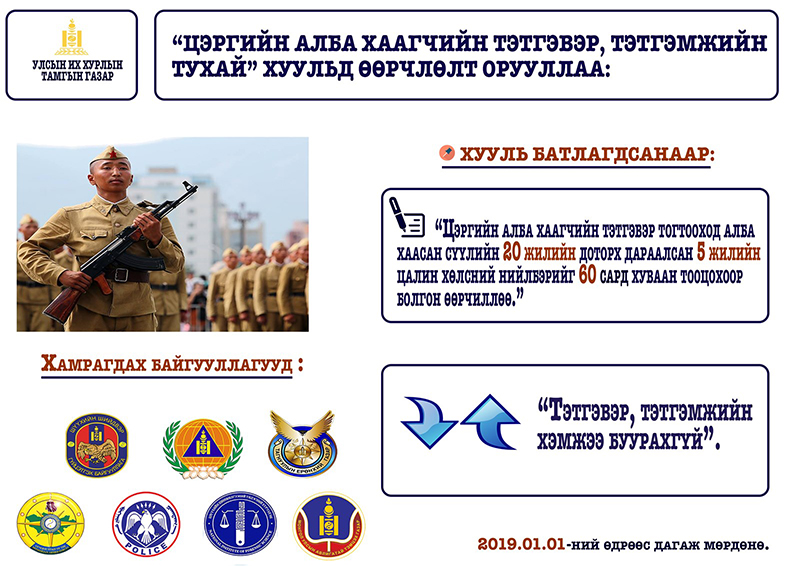 Монгол Улсын Их Хурлын гишүүн С.Бямбацогт, Б.Дэлгэрсайхан, Ж.Энхбаяр, Б.Энх-Амгалан нарын 4 гишүүнээс 2018 оны 09 дүгээр сарын 27-ны өдөр Улсын Их Хуралд өргөн мэдүүлсэн Цэргийн алба хаагчийн тэтгэвэр, тэтгэмжийн тухай хуульд өөрчлөлт оруулах тухай болон Хууль хүчингүй болсонд тооцох тухай хуулийн төслийг Монгол Улсын Их Хурал хэлэлцэж 2018 оны 10 дугаар сарын 19-ний өдөр баталлаа. ДЭЛГЭРЭНГҮЙ