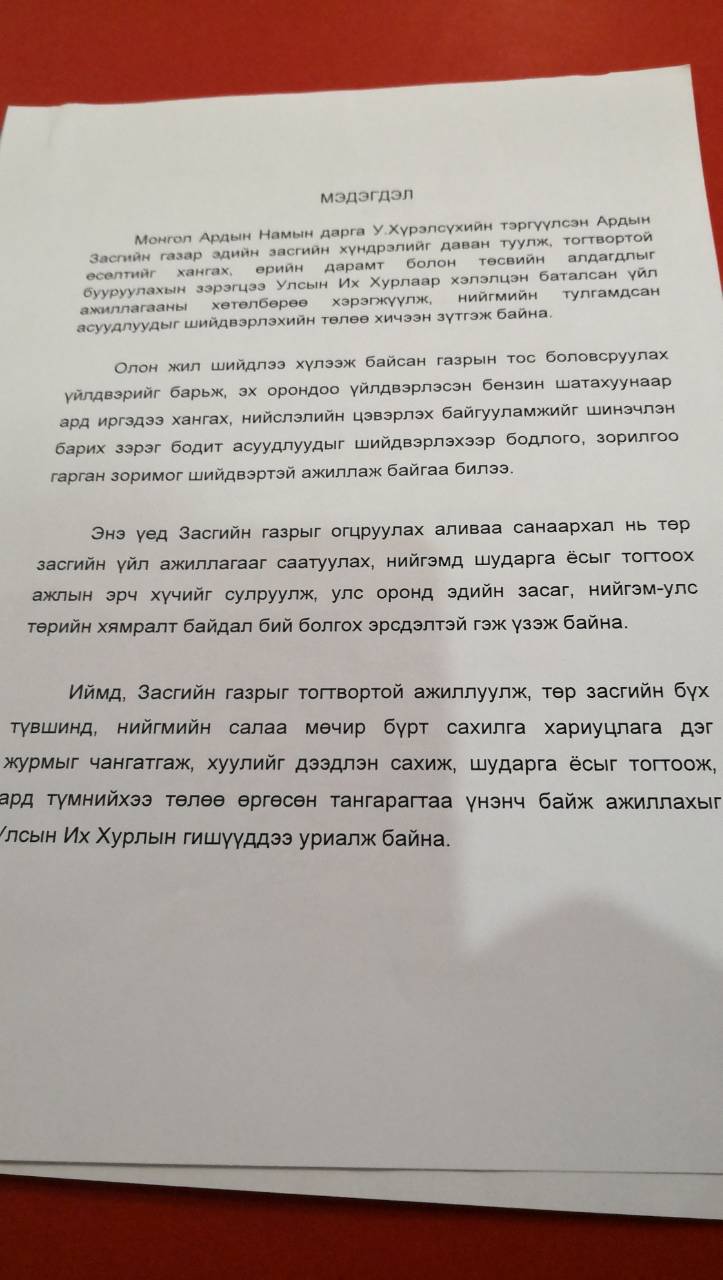 Odoo yamar sangaas gusaj ene alban tushaaldaa uldeh bol… GAIHAMSHIG URGELJILSEER….