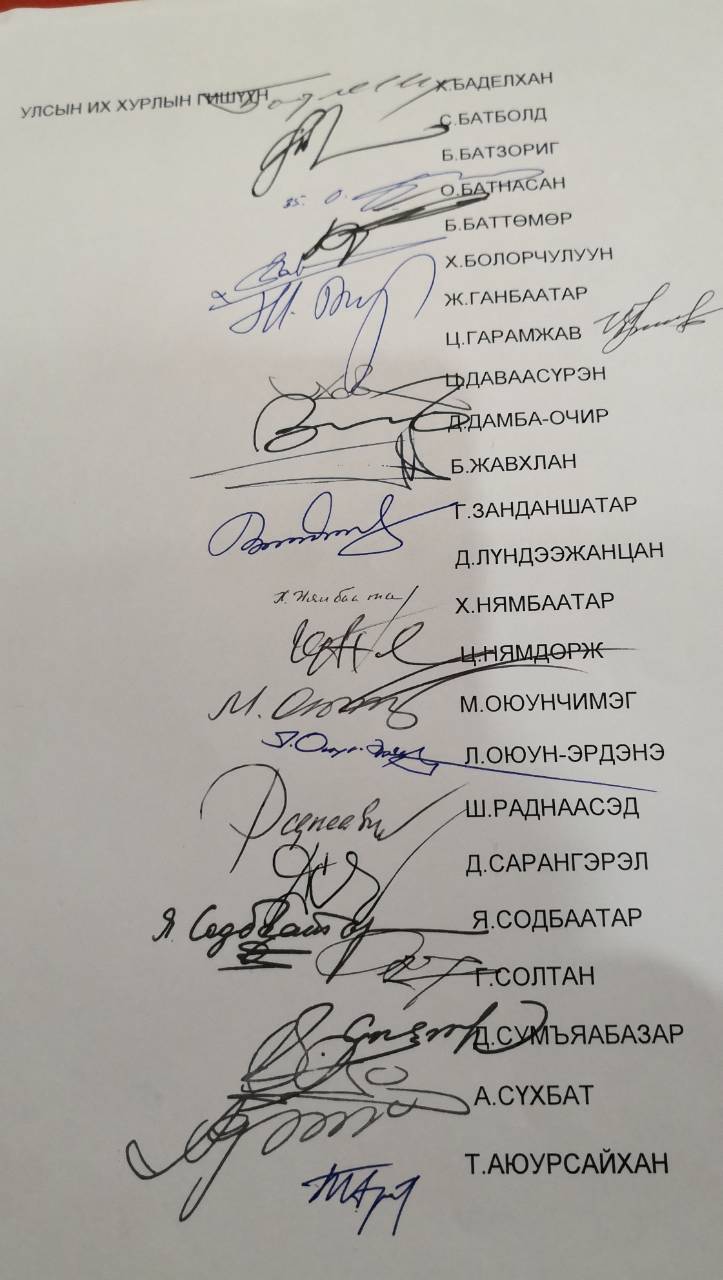 Засгийн газрыг тогтвортой ажиллуулах шаардлагатай гэсэн бичигт дараах гишүүд одоогоор албан ёсоор гарын үсэг зурсан байна.Тодруулбал,