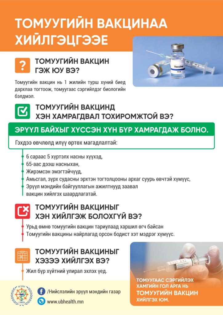 Нийслэлийн Эрүүл мэндийн газраас томуу, томуу төст өвчний үед авч хэрэгжүүлэх арга хэмжээ, бэлэн байдлыг хангах ажлын хүрээнд улирлын томуугийн вакцинаар дархлаажуулах ажлыг зохион байгуулж байна. Энэ сарын 27-ны байдлаар, нийслэлийн хэмжээнд улирлын томуугийн вакцинд нийт 80.361 хүн хамрагдахаас 79.419 хүнийг хамруулжээ.