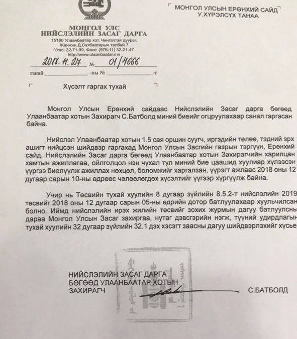 Харин өнөөдрийн /2018.11.27/ НИТХ-аар Хотын дарга С.Батболдыг албан тушаалаас нь огцруулах эсэх асуудлыг хэлэлцэх байсан ч НИТХ дахь АН-ын бүлэг тав хоногийн завсарлага авлаа. Тэгвэл Хотын дарга С.Батболд албан тушаалаа хүлээлгэж өгөх өргөдлөө өгчээ. Тэрбээр Ерөнхий сайд У.Хүрэлсүхэд гаргасан ажлаас чөлөөлөгдөх хүсэлтдээ нийслэлийн төсвийг батлуулсныхаа дараа буюу ирэх арванхоёрдугаар сарын 10-ны дотор ажлаа хүлээлгэж өгөхөө онцолжээ.