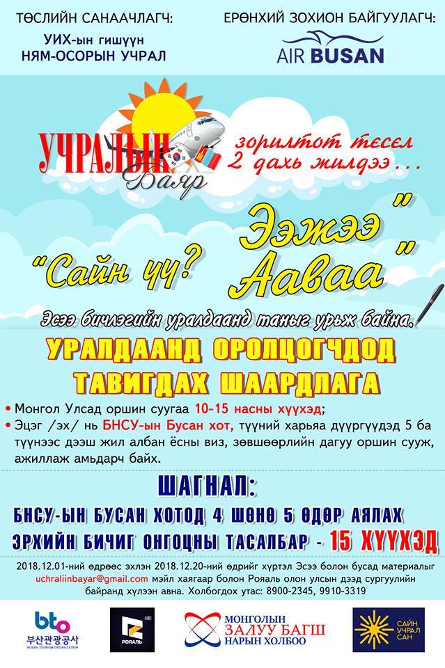 • ТӨСӨЛД ХАМРАГДАХ БОЛЗОЛЫГ ХАНГАСАН 15 ХҮҮХДИЙГ 2019 ОНЫ 1 ДҮГЭЭР САРД БНСУ-ЫН БУСАН ХОТОД 5 ӨДӨР, 4 ШӨНИЙН ХӨТӨЛБӨРТ ҮНЭ ТӨЛБӨРГҮЙ АЯЛУУЛЖ, ЭЭЖ, ААВТАЙ НЬ УУЛЗУУЛЖ “УЧРАЛЫН БАЯР” НЭВТРҮҮЛЭГТ ОРОЛЦУУЛНА.