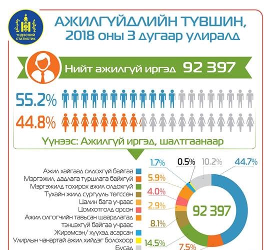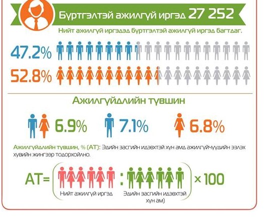 Нийт бүртгэлтэй ажилгүй иргэд 27.3 мянга болсон нь өмнөх оны мөн үеэс 3.1 мянган хүнээр, өмнөх сараас 3.1 мянган хүнээр тус тус өссөн байна. Бүртгэлтэй ажилгүй иргэдийн 14.4 мянга нь эмэгтэйчүүд байна. Бүртгэлтэй ажилгүй иргэдийн 10.3 мянга нь Улаанбаатарт, 5.7 мянга нь Хангайн бүсэд, 4.4 мянга нь Төвийн бүсэд, 4.3 мянга нь Баруун бүсэд, 2.6 мянга нь Зүүн бүсэд ногдож байгаа аж. Улсын хэмжээнд бүртгэлтэй ажилгүй иргэдийн 522 нь хөгжлийн бэрхшээлтэй иргэд байна. Тэдний 241 нь эмэгтэйчүүд аж.