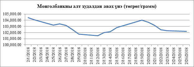 2018 оны аравдугаар сарын 15-ны өдрөөс арваннэгдүгээр сарын 30-ны өдрийн байдлаар Дархан-Уул аймаг дахь Монголбанкны хэлтэс 93.3 кг алт, Баянхонгор аймаг дахь Монголбанкны салбар 41.6 кг алт худалдаж авсан үзүүлэлттэй байна. Арваннэгдүгээр сарын байдлаар 1 грамм алт худалдан авах Монголбанкны дундаж үнэ 100,995.34 төгрөг байлаа.