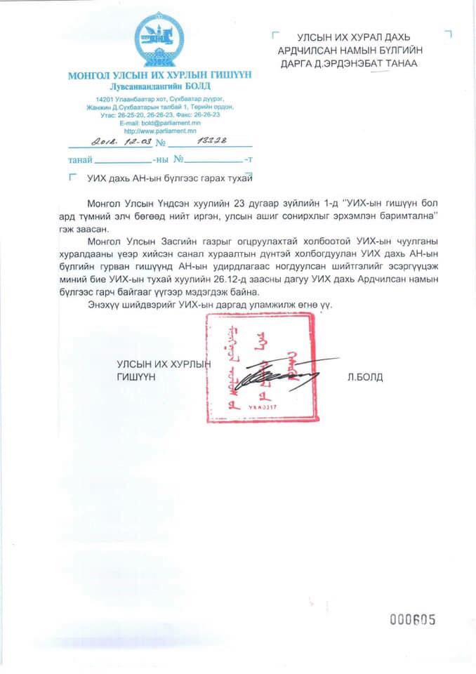 Тус албан бичигт “Монгол Улсын Үндсэн хуулийн 23 дугаар зүйлийн 1-д “УИХ-ын гишүүн бол ард түмний элч бөгөөд нийт иргэн, улсын ашиг сонирхлыг эрхэмлэн баримтална” гэж заасан.