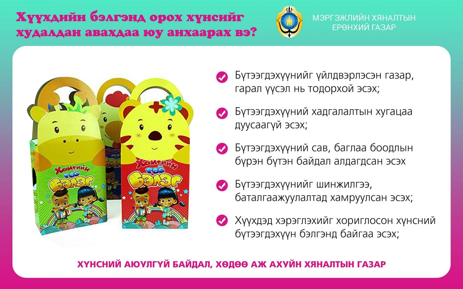 Хүнсний түүхий эд, бүтээгдэхүүн худалдан авахдаа бүтээгдэхүүний үйлдвэрлэсэн газар, гарал үүсэл тодорхой эсэх, хадгалах болон хэрэглэж дуусах хугацаа хэтэрсэн эсэх, сав, баглаа боодлын бүрэн бүтэн байдлыг шалган авч хүүхдийнхээ эрүүл мэндэд үүсч болзошгүй эрсдэлээс урьдчилан сэргийлэх нь чухал юм. Түүнчлэн хүүхдийн насны онцлогт тохирсон бэлэг сонгохоос гадна нөөшилсөн болон лаазалсан бүтээгдэхүүний чанарт онцгой анхаарахыг зөвлөж байна.
