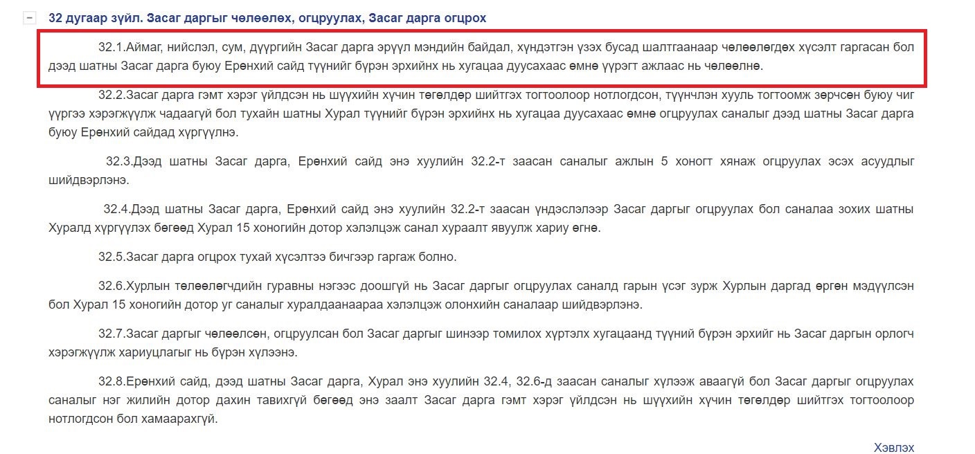 32.1.Аймаг, нийслэл, сум, дүүргийн Засаг дарга эрүүл мэндийн байдал, хүндэтгэн үзэх бусад шалтгаанаар чөлөөлөгдөх хүсэлт гаргасан бол дээд шатны Засаг дарга буюу Ерөнхий сайд түүнийг бүрэн эрхийнх нь хугацаа дуусахаас өмнө үүрэгт ажлаас нь чөлөөлнө.