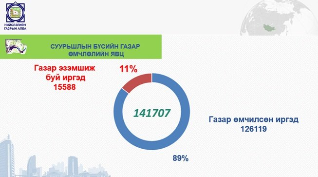 НЗД-ийн 2017 оны А/18 дугаар захирамжаар Улаанбаатар хотын суурьшлын бүсийн хил хязгаарыг тогтоосон бөгөөд суурьшлын бүс дэх газар өмчлөлийг 89 хувь хүргэлээ.