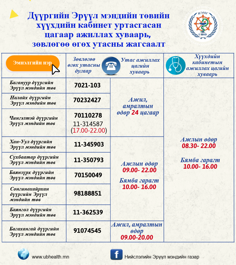 Томуу, томуу төст өвчин ихсэж байгаатай холбогдуулан дүүргийн эрүүл мэндийн төвүүд ажлын болон амралтын өдрүүдэд дээрх цагийн хуваарийн дагуу уртасгасан цагаар ажиллаж иргэдэд эмнэлгийн тусламж, үйлчилгээг түргэн шуурхай, хүртээмжтэй байдлаар үзүүлэхээр зорьж байна.