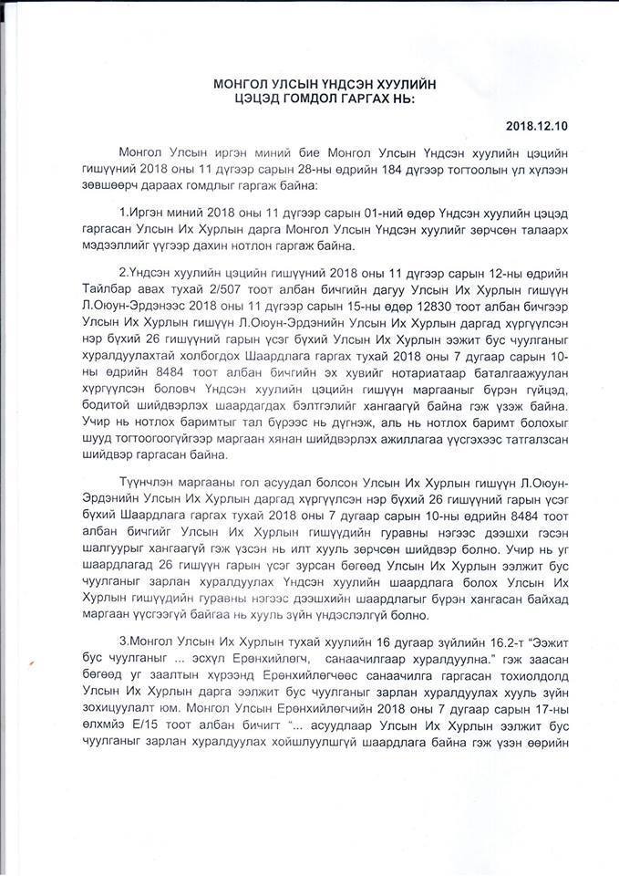 Уг гомдолд “Үндсэн хуулийн цэцийн гишүүний 2018.11.12-ны өдрийн тайлбар өгөх тухай 2/507 тоот албан бичгийн дагуу УИХ-ын гишүүн Л.Оюун-Эрдэнээс 2018.11.15-ны өдөр 12830 тоот албан бичгээр УИХ-ын даргад хүргүүлсэн 26 гишүүний гарын үсэг бүхий УИХ-ын ээлжит бус чуулганыг хуралдуулахтай холбогдох шаардлага гаргах тухай 2018.07.10-ны өдрийн 8484 тоот албан бичгийн эх хувийг нотариатаар баталгаажуулан хүргүүлсэн боловч Үндсэн хуулийн цэцийн гишүүн маргааныг бүрэн гүйцэд, бодитой шийдвэрлэх шаардагдах бэлтгэлийг хангаагүй байна гэж үзэж байна. Учир нь нотлох баримтыг тал бүрээс нь дүгнэж, аль нь нотлох баримт болохыг шууд тогтоогоогүйгээр маргаан хянан шийдвэрлэх ажиллагаа үүсгэхээс татгалзсан шийдвэр гаргасан байна.