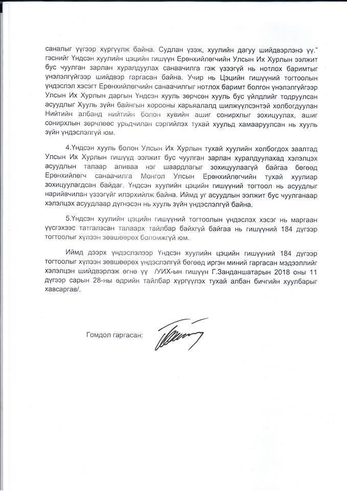 Иймд дээрх үндэслэлээр Үндсэн хуулийн цэцийн гишүүний 184 дүгээр тогтоолыг хүлээн зөвшөөрөх үндэслэлгүй бөгөөд миний гаргасан мэдээллийг хэлэлцэн шийдвэрлэж өгөн үү” гэжээ.