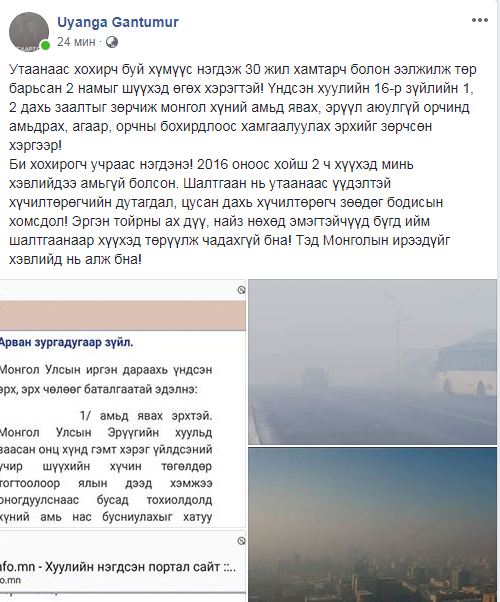 Харамсалтай нь энэ эрх зөрчигдөж, нийслэл хотод амьдарч байгаа иргэн бүрийн амь насанд аюул учраад байна. Тиймээс утаанаас болж хохирч буй иргэд нэгдэж 30 жил ээлжилж төр барьсан хоёр намыг шүүхэд өгөх хэрэгтэй хэмээн УИХ-ын гишүүн асан Г.Уянга өөрийн сошиал хуудсаар дамжуулан уриалжээ. Тэрбээр “Монгол хүний амьд явах, эрүүл аюулгүй орчинд амьдрах, агаар, орчны бохирдлоос хамгаалуулах эрхийг зөрчсөн хэргээр!