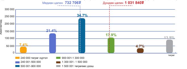 Медиан цалин гэдэг нь ажиллагсдын цалинг өсөх эсвэл буурах эрэмбээр байршуулсан цувааг таллан хувааж байгаа ажилтны цалин юм. Тэгвэл наймдугаар сарын байдлаар медиан цалин 725 110 төгрөг байсан бол энэ оны хоёрдугаар сарын байдлаар медиан цалин 753.7 мянган төгрөг байсан. Тэгэхээр арваннэгдүгээр сарын медиан цалингийн 732.7 мянган төгрөг гэсэн үзүүлэлт энэ оны эхэн үетэй харьцуулахад буурсан тоо байна.