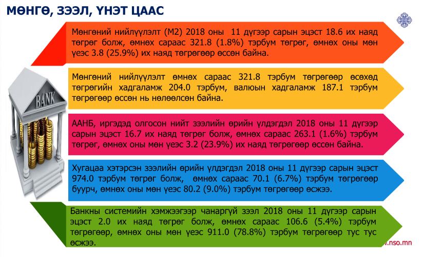 Нийгэм, эдийн засгийн тоон үзүүлэлтүүд арваннэгдүгээр сард хэрхэн гарсныг хүргэе. Мөнгөний нийлүүлэлт өмнөх оны мөн үеэс 3.8 их наяд төгрөгөөр өссөн байна. ОУВС-гийн зүгээс мөнгөний нийлүүлэлтийг хумих чиглэлд анхаарахыг зөвлөсний дараа Төв банк Бодлогын хүүг чангаруулах шийдвэрийг гаргаад буй. Тэгвэл өнгөрсөн нэг жилийн хугацаанд мөнгөний нийлүүлэлт өсөлттэй байгааг ҮСХ-ны мэдээлэл харуулж байна.