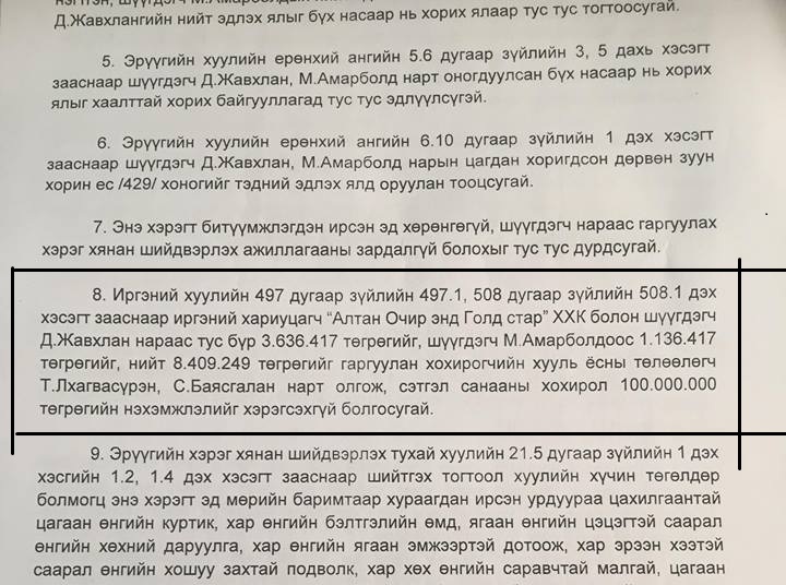 -"Очир" төвийг ажиллуулдаг “Алтан Очир энд Голд стар” ХХК болон шүүгдэгчдийн ар гэрээс нийт 8.409.249 төгрөг гаргуулахаар шүүх шийдвэрлэсэн. "Очир" төв болон Д.Жавхлан нараас тус бүрт нь 3 сая 636 мянган төгрөг, М.Амарболд өмнө нь 2 сая 500 мянган төгрөг өгсөн байсан учраас түүнийг нь хасч 1 сая 136 мянган төгрөг олгох шүүхийн шийдвэр гарсан. Миний охин амиа алдсанаас хойш нэг жил, гурван сарын хугацаа өнгөрч байна. Хэрэг шүүхийн шатанд очих хүртэл "Очир" төв болон Д.Жавхлан М.Амарболд нарын зүгээс оршуулгын зардалд ямар нэгэн мөнгө өгөөгүй явж ирсэн. Харин хэрэг шийдэгдэхийн өмнө М.Амарболдын ар гэрийнхний зүгээс 2 сая 500 мянган төгрөг өгсөн. Нөгөө талуудын хувьд нөхөн олговор төлөөгүй.