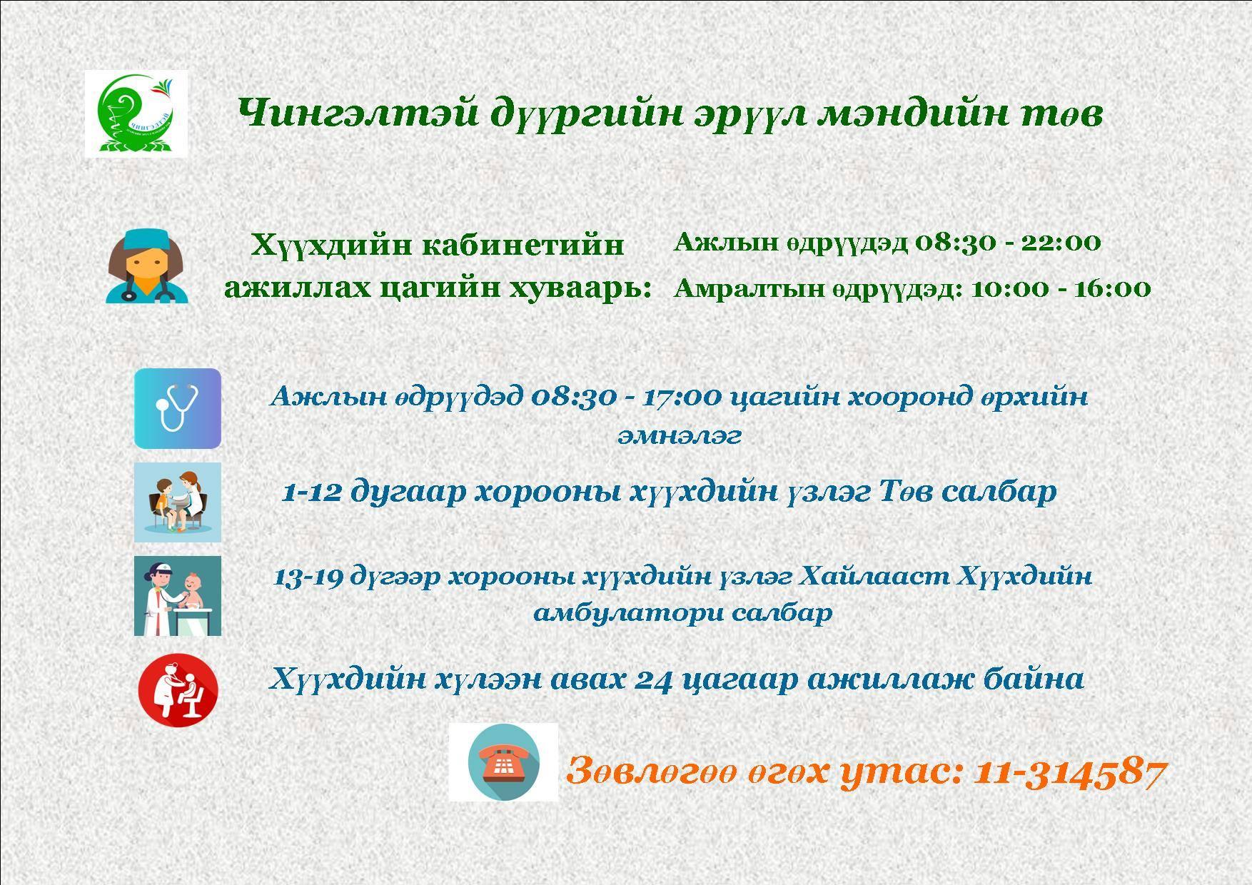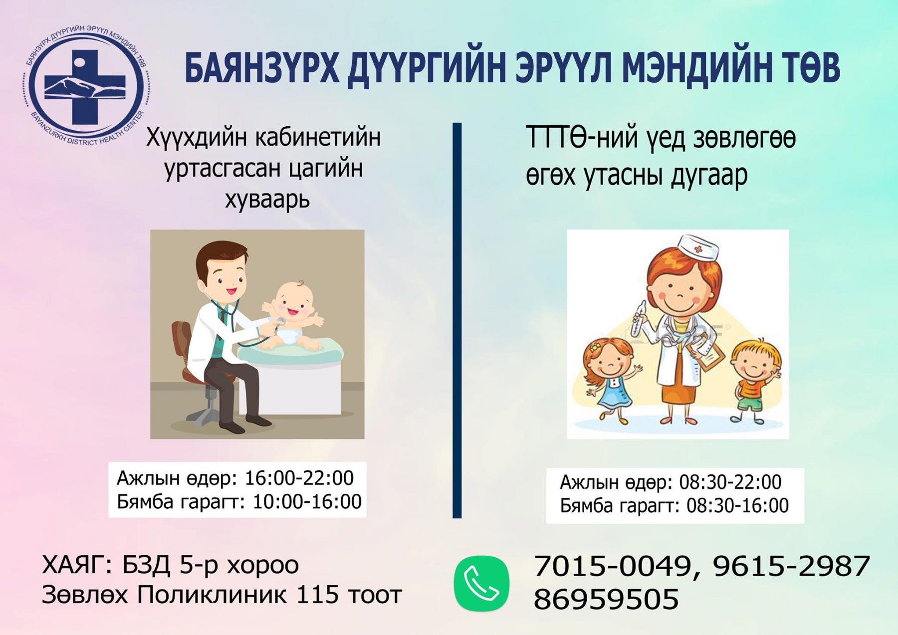 Томуу, томуу төст өвчин ихсэж байгаатай холбогдуулан дүүргийн эрүүл мэндийн төвүүд ажлын болон амралтын өдрүүдэд дээрх цагийн хуваарийн дагуу уртасгасан цагаар ажиллаж иргэдэд эмнэлгийн тусламж, үйлчилгээг түргэн шуурхай, хүртээмжтэй байдлаар үзүүлэхээр зорьж байна.
