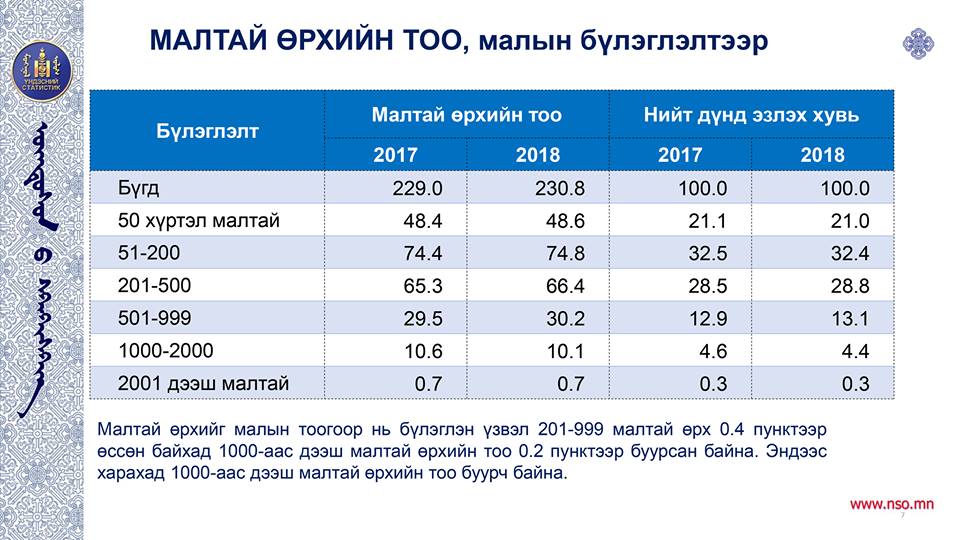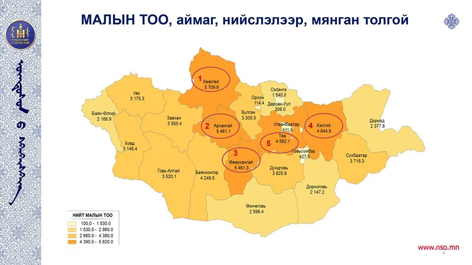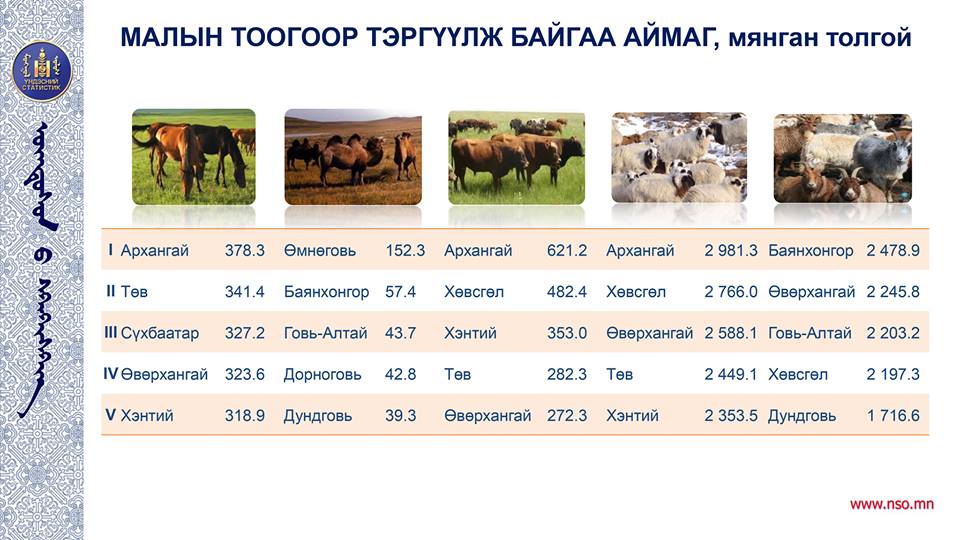 Үндэсний статистикийн хорооноос энэ сарын 7-17-н хүртэл улс орон даяар жилийн эцсийн мал тооллогыг зохион байгуулсан юм. Ингээд мал тооллогын статистик мэдээллийг хүргэе.