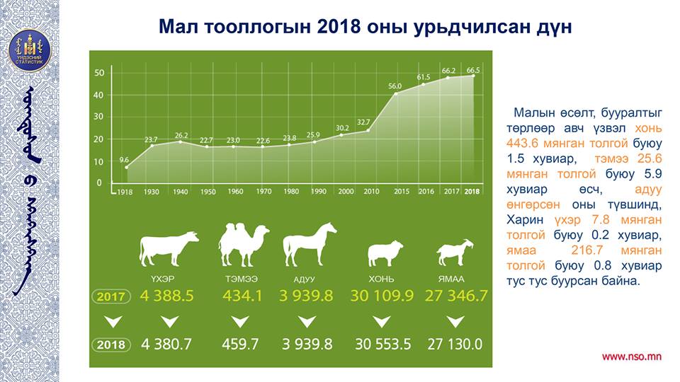 Монгол Улсын 2018 оны жилийн эцсийн мал тооллогын урьдчилсан дүнг Үндэсний статистикийн хорооноос танилцууллаа. Манай улсын малын тоо 66 сая 463 мянга 700 болж 2017 оноос 0.4 хувь буюу 244 700-гаар өсчээ.