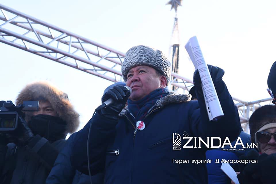 -Монголын ард түмэн М.Энхболдыг огцрохыг хоёр жил хүлээлээ. Гадаа хүйтэн байна. Идэр есийн хүйтэнд эр хүн, чоно хоёрын хийморь сэргэдэг юм гэсэн. Дарга нарын хийморь яадгийг мэдэхгүй юм. Бид ирээдүйн 30 жилийнхээ ирээдүйг тодорхойлмоор байна. Монголчууд дэндүү уужуу, дэндүү зөөлөн ард түмэн. Японд парламентийн удирдлага нь ийм үйлдэл гаргасан бол 48 цаг бүү хэл 24 цаг ч тэсэхгүй. Бүр амиа хорлох ч байсан байж магадгүй. М.Энхболд гэтэл ямар гээчийн хүн бэ? Би түүнийг эсэргүүцэж байна.