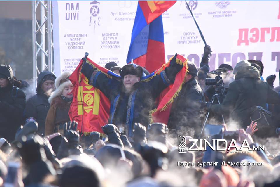 -Өнөөдөр бид зайлшгүй үр дүнд хүрэх ёстой. Монголын баялаг, газар нутгийг дээрэмдэх гэсэн дээрэмчид үеийн үед байсан. Харамсалтай нь, энэ цаг үед эдгээр дээрэмчид биежиж, босоо ороолон болчихоод байна. Та бид дархан нутагтаа эзэн нь байх юм уу? Боолоор амьдрах юм уу? Хөх толботны заяаг бурханд даатгаад орхичих юм уу? Бүгд эвлэлдэн нэгдэж, бүтэн улсаа аврах уу? Ийм гарцаагүй тулсан асуултуудад өнөөдөр хариу өгөх гэж байна. 100 жилийн өмнө бидний өвөг дээдэс энэ асуултад хариулсан. Тэд ган бат сахилга дор ганц зорилгын төлөө нэгдэж, газар нутгаа хамгаалсан юм. Бид маш сахилга баттай байх ёстой. М.Энхболд одоо Монголын төрөөс зайлах цаг болсон.