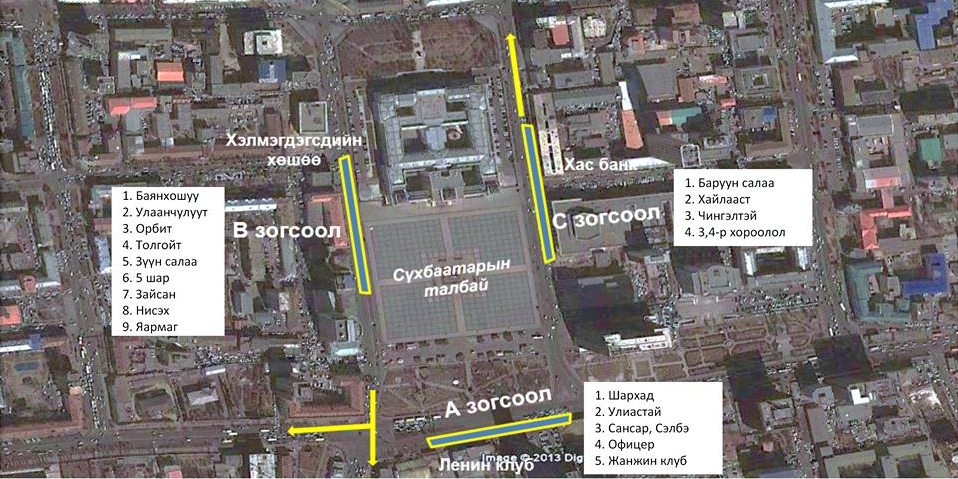 “Улаанбаатарын мөнгөн шөнө” шинэ жилийн баярын үйл ажиллагаа өндөрлөхөд Улаанбаатар хотын 18 чиглэлд 18 автобус Д.Сүхбаатарын талбайн баруун, зүүн болон урд зогсоол буюу дараах зурагт тэмдэглэсэн “А”, “B”, “С” зогсоолоос суурьшлын цэгүүд рүү иргэдэд үнэ төлбөргүй үйлчлэхээр болсон байна.