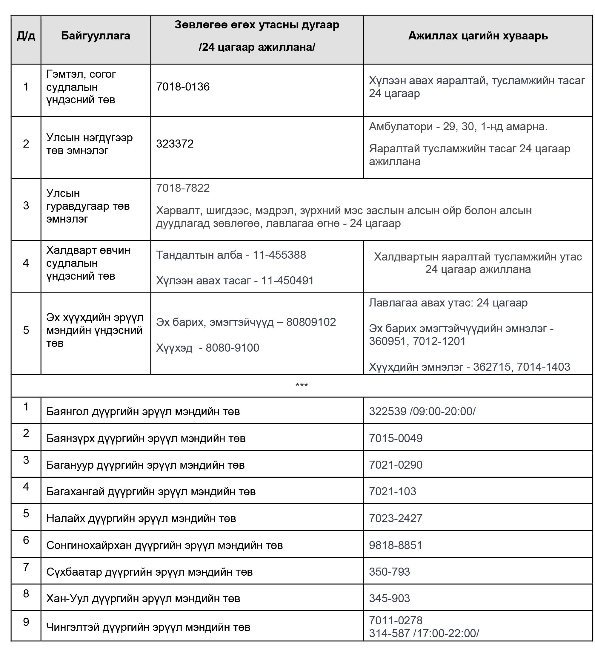 Шинэ жилийн баярын өдрүүд буюу 2018 оны арванхоёрдугаар сарын 29-ний өдрөөс 2019 оны нэгдүгээр сарын 02-ны өдөр хүртэл дүүргийн эрүүл мэндийн төвийн Гэмтэл, Мэс засал, Дотор, Шүд, Хүүхдийн кабинетууд болон Шүд эрүү нүүрний төв, Өрхийн эрүүл мэндийн төвүүд 10:00-16:00 цагийн хооронд ажиллах аж.