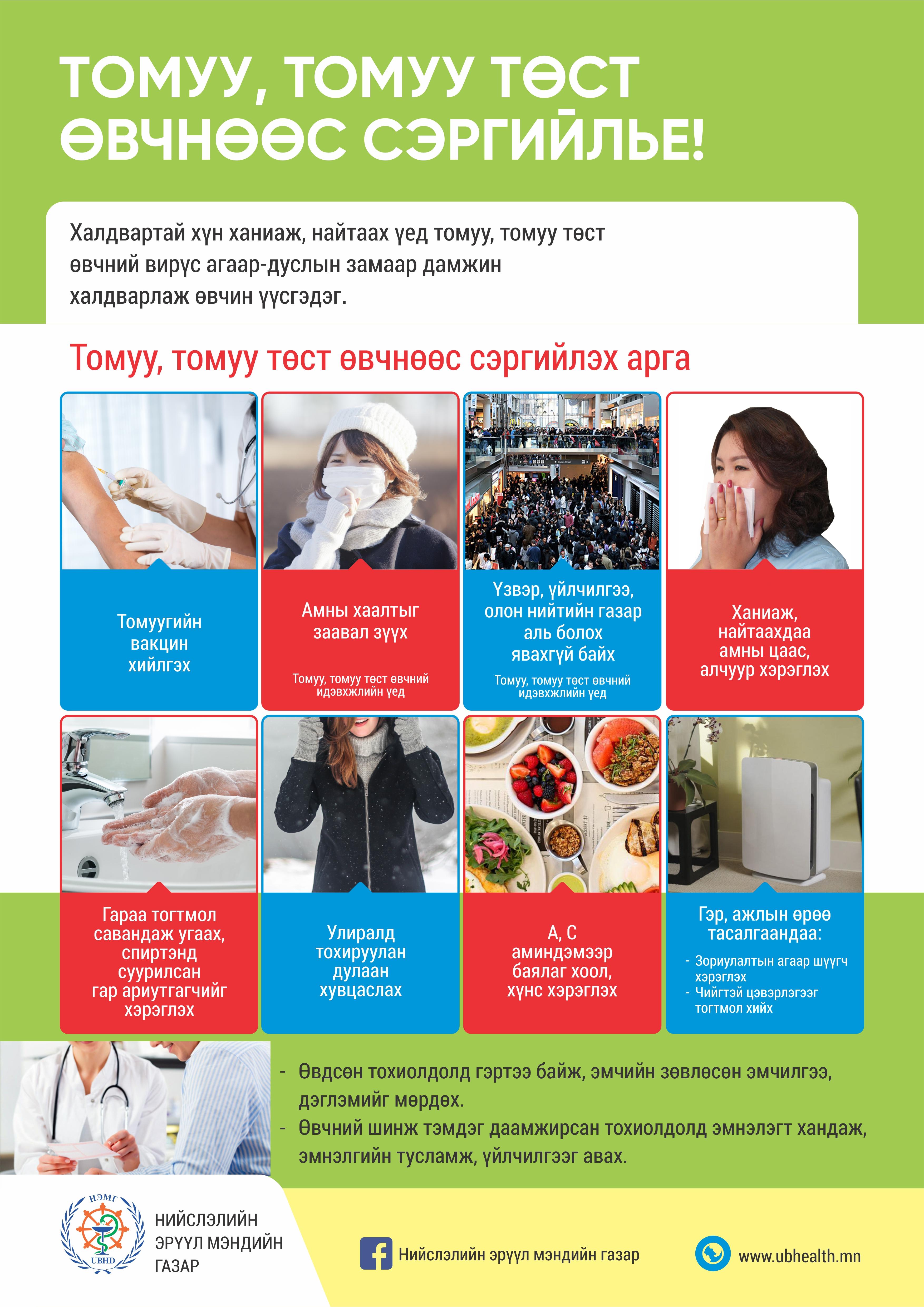 Томуу, томуу төст өвчнөөс урьдчилан сэргийлж, өдөр тутамдаа хийж хэвшүүлэх дадал, зөвлөмжийг Нийслэлийн Эрүүл мэндийн газраас хүргэж байна.